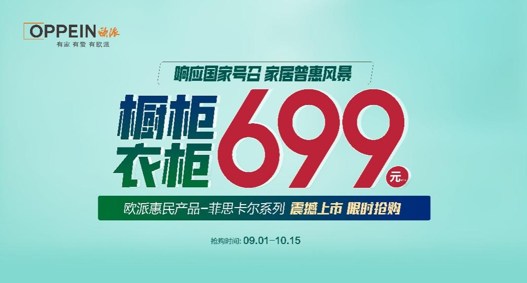 作為中國定制家居領軍品牌,歐派秉承高度社會責任感,積極響應國家促進家居消費的號召,在金九銀十的家居消費旺季,投入10億巨額補貼,大幅讓利消費者,重磅推出歷年來優惠力度前所未有的惠民產品:菲思卡爾惠民系列衣柜/櫥柜699元/㎡(m),限時鉅惠,于9月1日至10月15日開啟家居惠民風暴,助力更多國人實現“有家有愛有歐派”的美好人居生活。