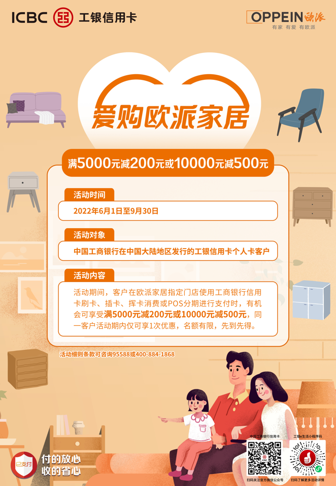 活動期間,客戶在歐派家居指定門店使用工商銀行信用卡刷卡、插卡、揮卡消費或POS分期進行支付時,有機會可享受滿5000元減200元或滿10000元減500元,同一客戶活動期內僅可享1次優惠,名額有限,先到先得。