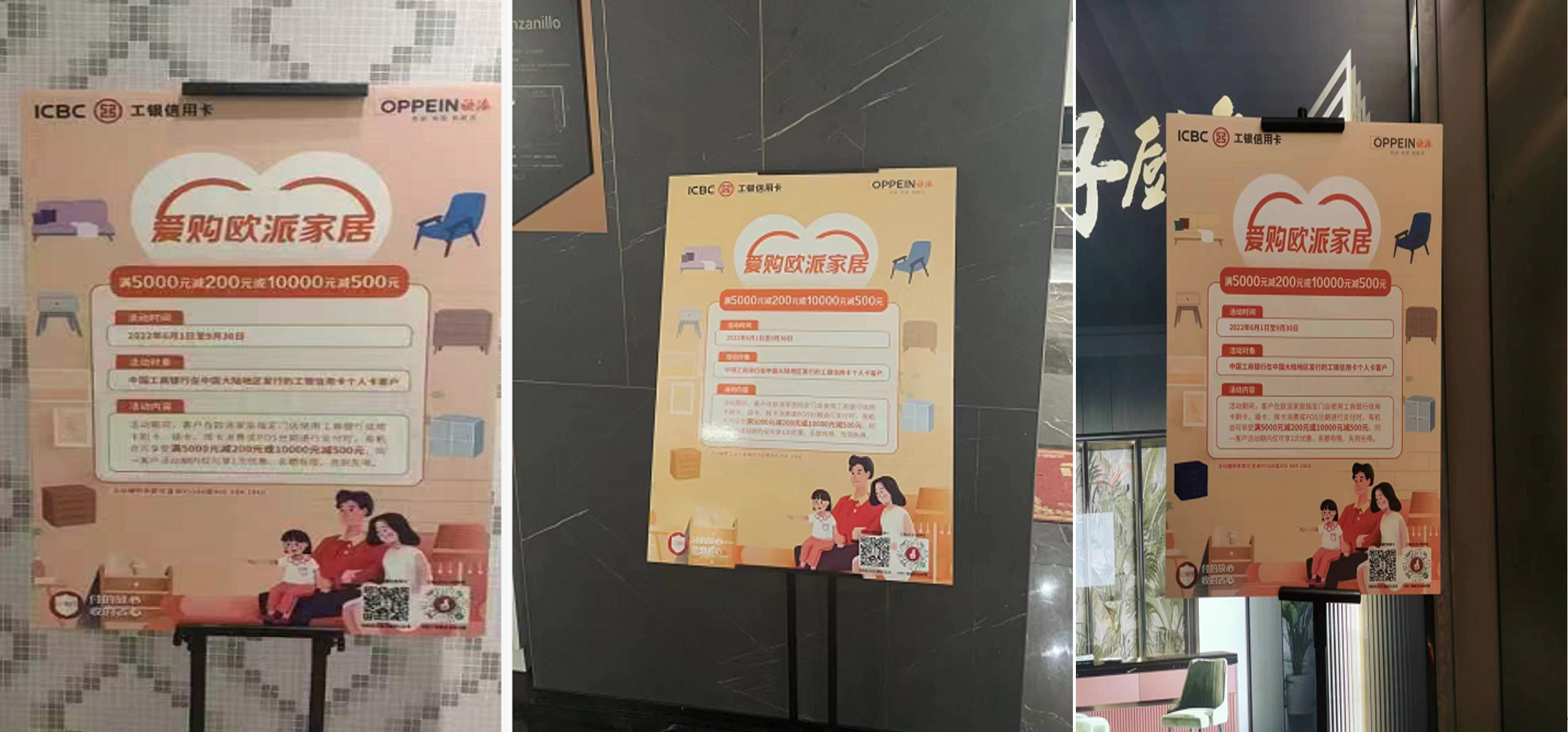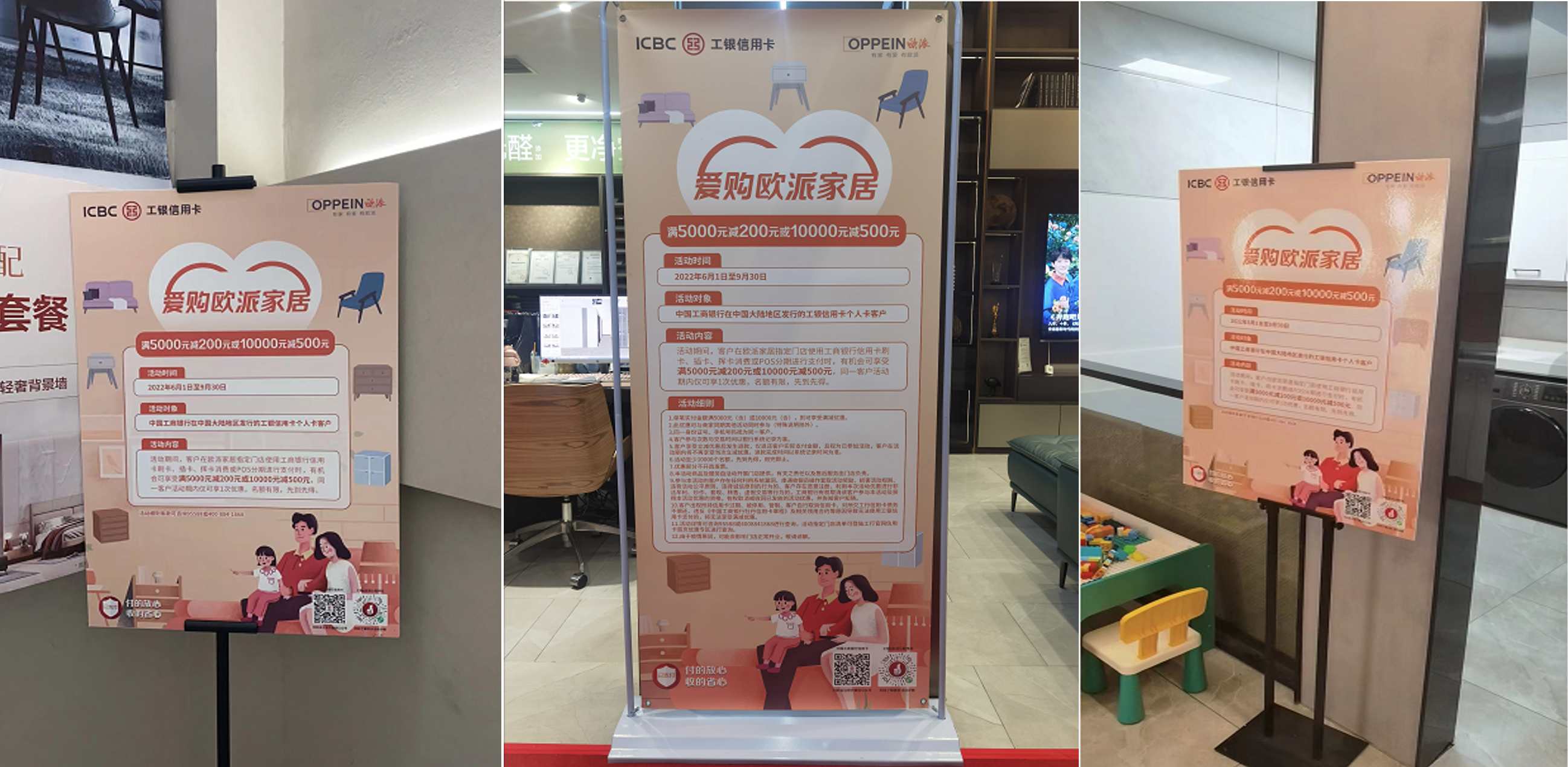 在全國指定歐派家居商場內,消費者使用工商銀行信用卡刷卡、揮卡、插卡支付歐派家居產品訂單,可享受滿5000元減200元或滿10000元減500元,名額有限,先到先到。