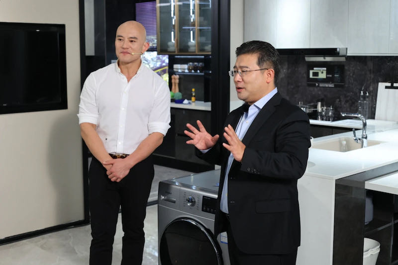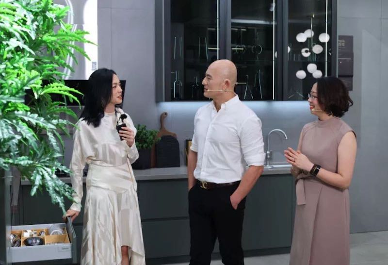 主持人彭鷹(左一)與博西家用電器集團大中華區廚電產品業務單元高級副總裁 Christof Jaeger(左三)同臺直播