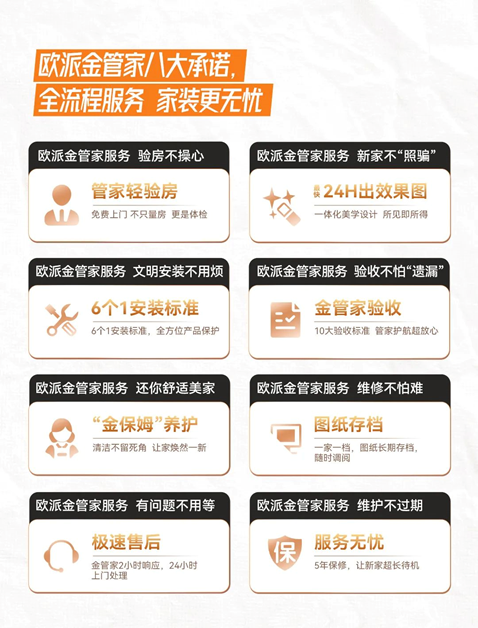 不僅如此,歐派家居還有著更為宏大的品牌升級規(guī)劃。歐派家居上線“金管家服務”,推出管家輕驗房、24H出效果圖、6個1安裝標準、金管家驗收、“金保姆”養(yǎng)護、圖紙存檔、極速售后、服務無憂八大承諾,為消費者提供“高質(zhì)高效”服務,讓消費者享受“省時省力”體驗。