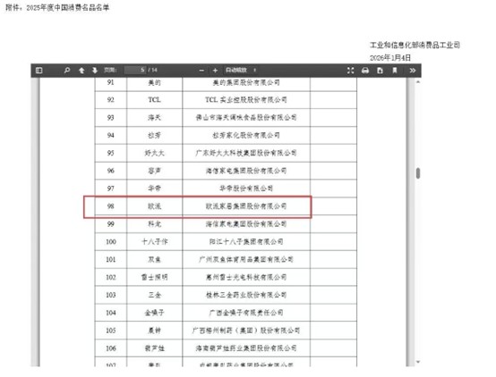 2026年1月4日,工業和信息化部消費品工業司正式公示了2025年度“中國消費名品”名單。在這份匯聚了中國制造頂尖力量的權威榜單中,歐派家居集團股份有限公司(簡稱“歐派家居”) 憑借其在家居領域的深遠影響力、持續創新的產品力與深入人心的品牌價值,與美的、TCL、海天等國民級品牌共同躋身榮譽殿堂,彰顯了其作為行業標桿的領軍地位。
